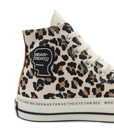 - لوگوی Brain Dead: لوگو یا نشانههای Brain Dead به صورت برجسته یا پچهای لاستیکی در کنار لوگوی کلاسیک All Star کانورس روی کفش قرار میگیرد.